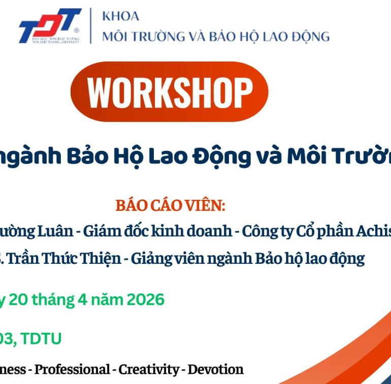 Ngày 20/4/2026, Khoa MT&BHLĐ đã tổ chức chương trình workshop “Kiến thức ngành Bảo hộ Lao động và Môi trường 2026” tại Hội trường A0403. Chương trình thu hút sự tham gia của đông đảo giảng viên, chuyên gia và sinh viên quan tâm đến lĩnh vực an toàn, sức khỏe nghề nghiệp và môi trường.