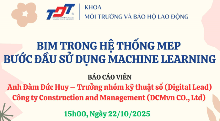 Trong khuôn khổ chuỗi Sinh hoạt học thuật năm học 2025–2026, Khoa MT&BHLĐ đã tổ chức buổi báo cáo chuyên đề với chủ đề: “BIM trong hệ thống MEP – Bước đầu sử dụng Machine Learning”, do ThS. Đàm Đức Huy – Construction and Management (DCMvn Co., Ltd), Digital Lead – làm báo cáo viên.