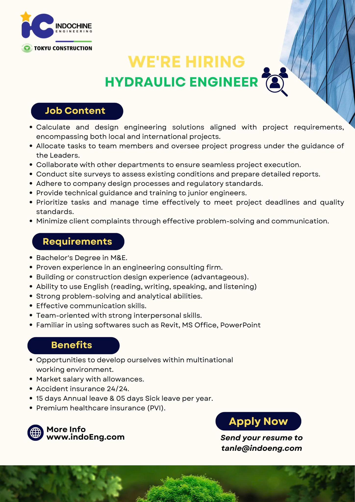 Phòng cấp thoát nước - Indochine Engineering thông báo tuyển dụng Kỹ sư Thủy lực (Hydraulic Engineer) làm việc trong môi trường quốc tế năng động, chuyên nghiệp và có cơ hội phát triển nghề nghiệp trong các dự án quy mô tại Việt Nam và khu vực.