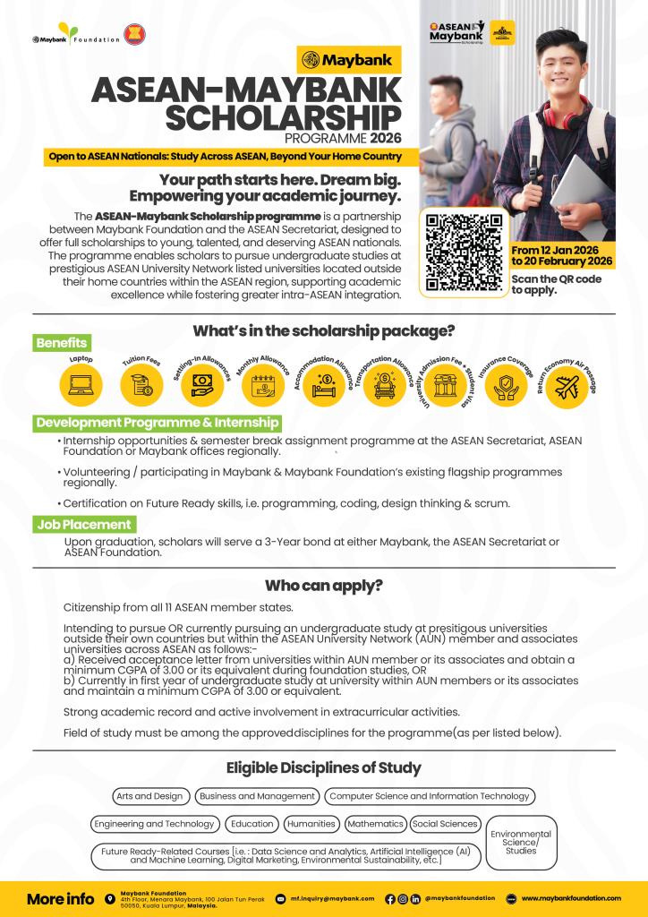 Chương trình Học bổng ASEAN – Maybank Scholarship Programme 2026, do Maybank Foundation phối hợp với Ban Thư ký ASEAN triển khai.