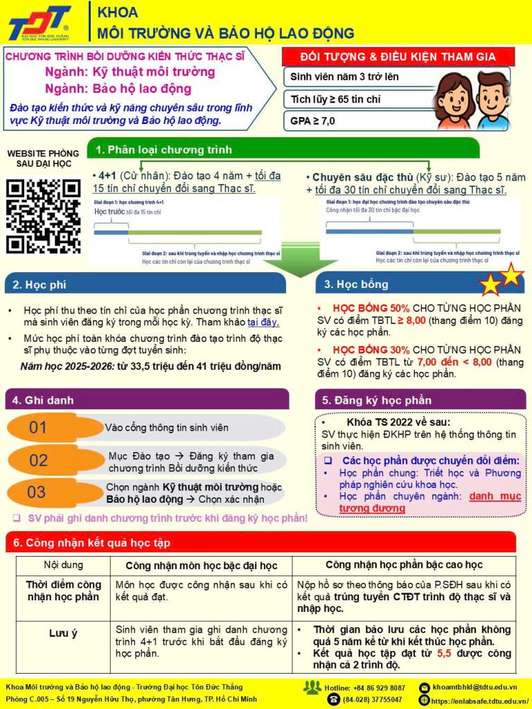 Nhằm đáp ứng nhu cầu cung cấp nguồn nhân lực trình độ cao cho xã hội, Khoa Môi trường & Bảo hộ Lao động đưa vào đào tạo Chương trình 4+1, cho phép sinh viên khoa được đăng ký học và tích lũy một số học phần của chương trình đào tạo trình độ thạc sĩ của 2 ngành Bảo hộ lao động và Kỹ thuật môi trường, đồng thời giúp sinh viên nâng cao chuyên môn và rút ngắn thời gian học tập so với tổng thời gian đào tạo trình độ thạc sĩ.